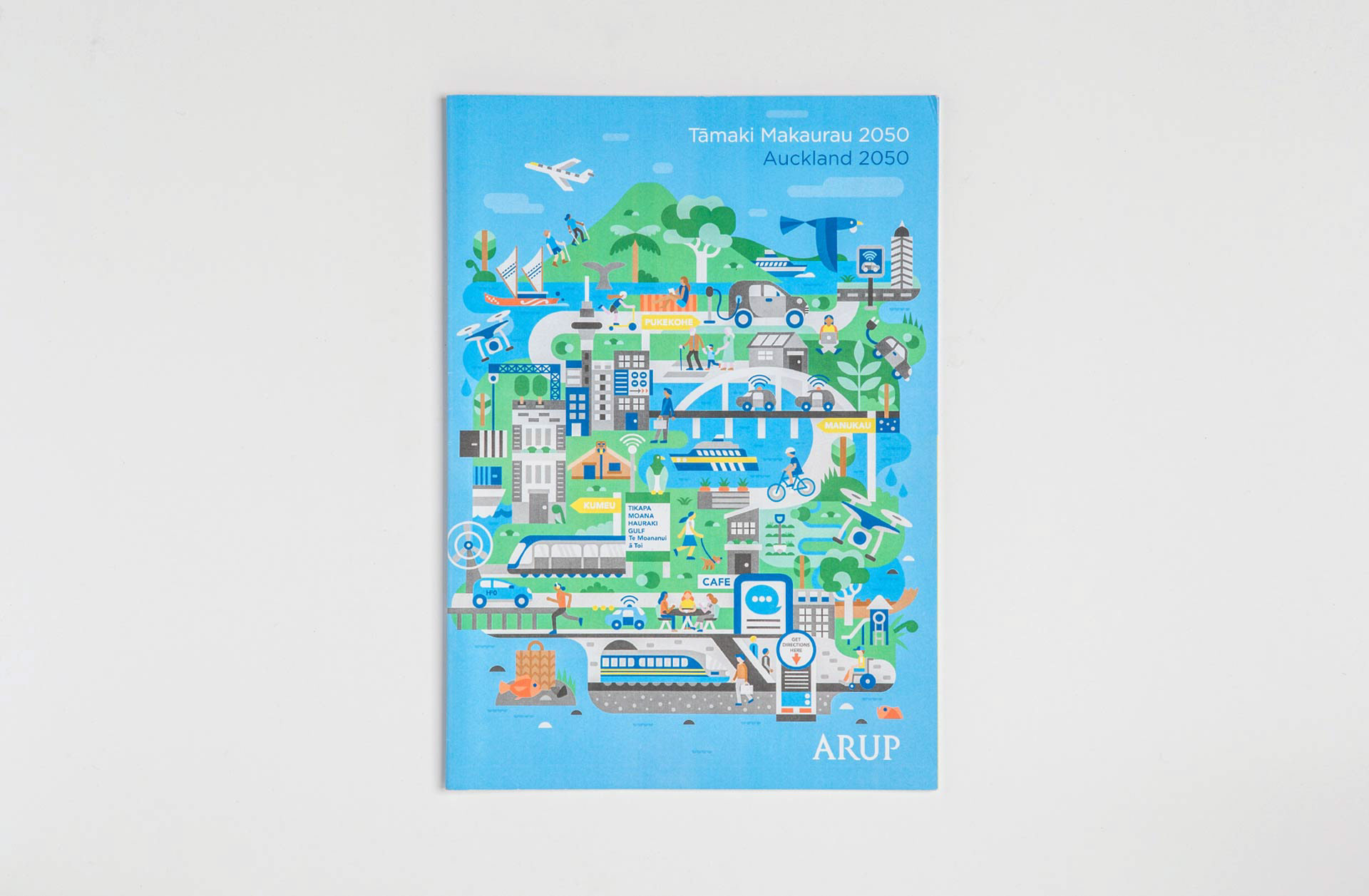Front cover illustration for a document depicting how Auckland will look in 2050 based on Arup’s vision for Tāmaki Makaurau as a contemporary Auckland that reflects who we are, a place diverse in culture and people, guided by Te Ao Māori for a contemporary identity, reaching confidently out to the world from our place Aotearoa here at the heart of Te Mōana Nui a Kiwa.