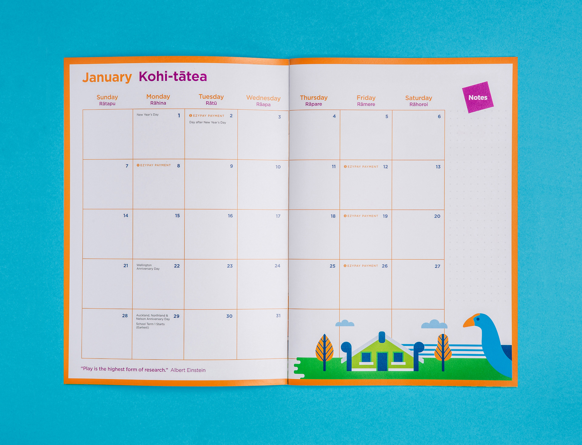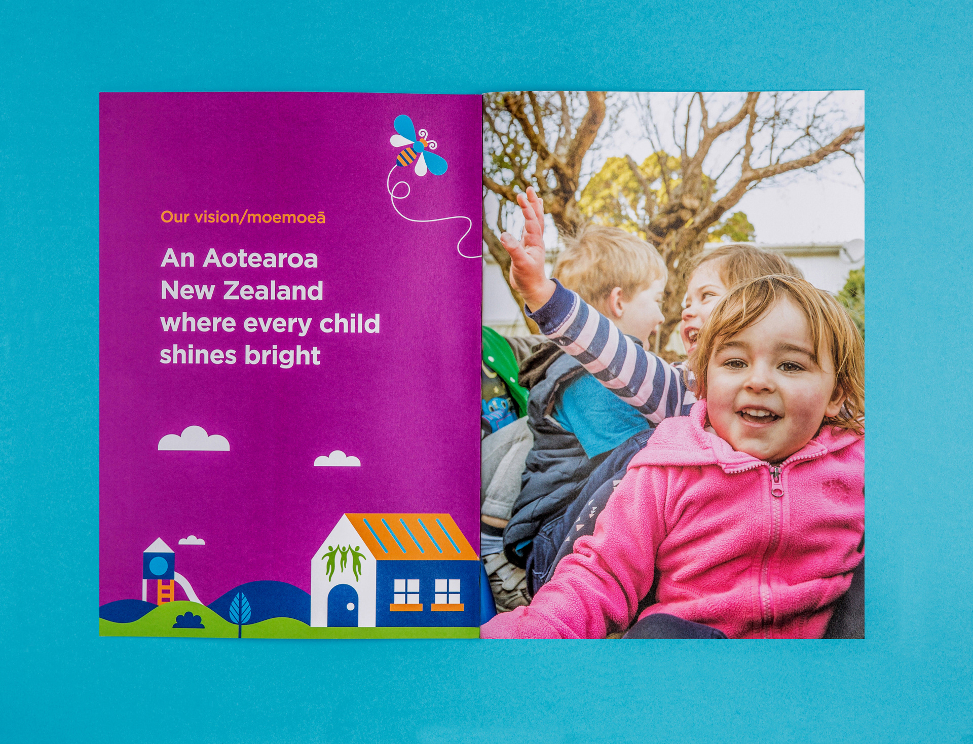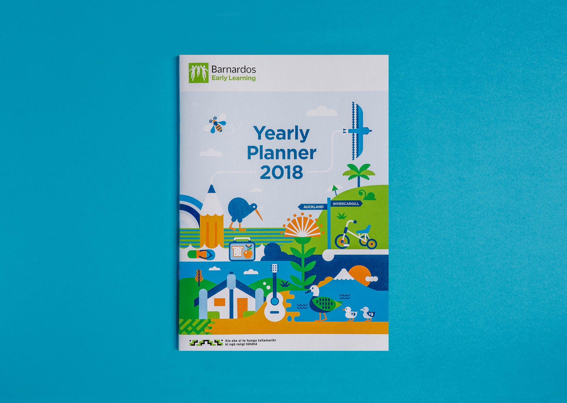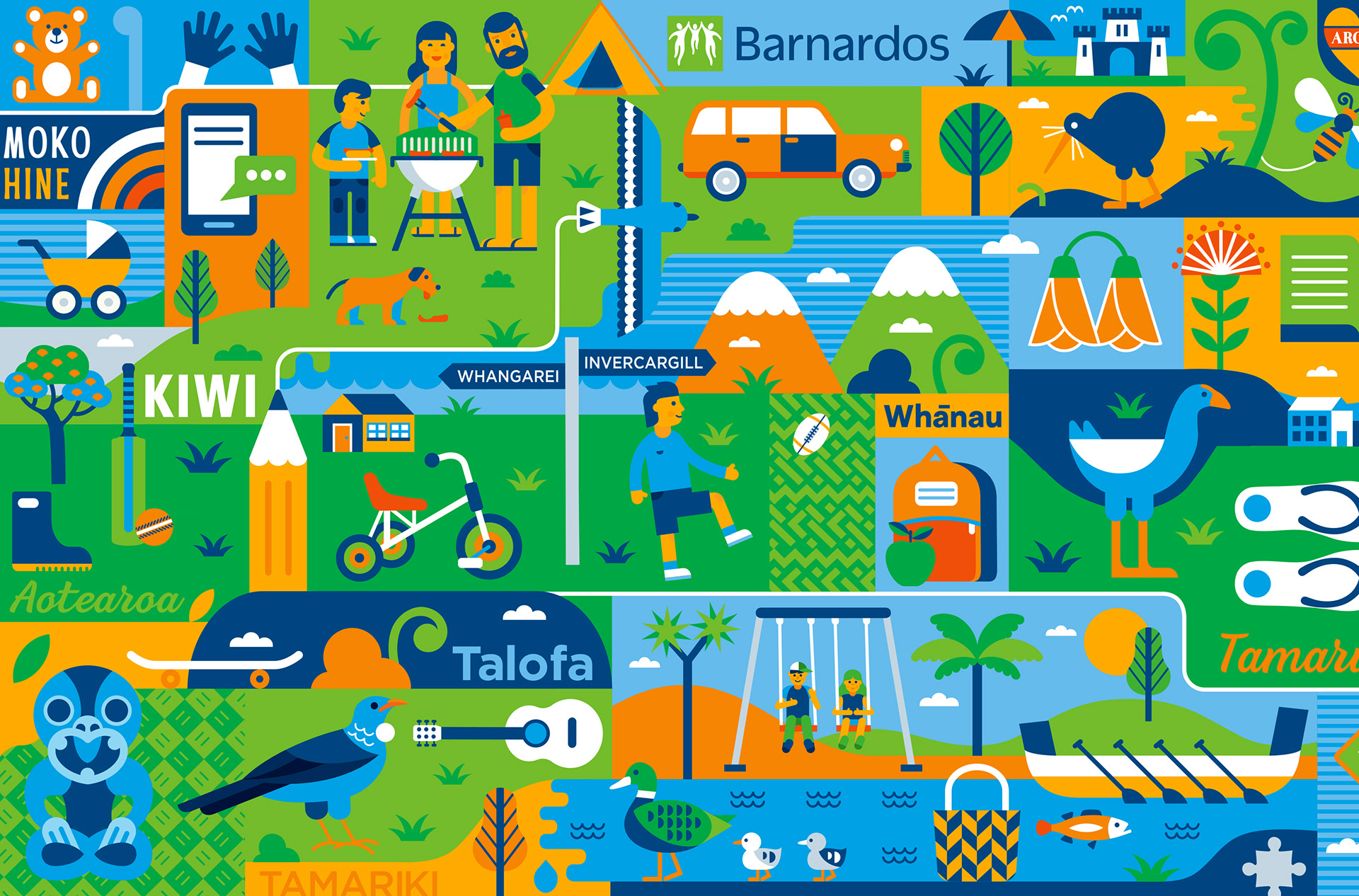 Custom illustration for Barnardos Early Learning. The illustration was inspired by Kiwi childhoods and represents Barnardos Early Learning, our tamariki, our whānau and the diverse communities across Aotearoa
